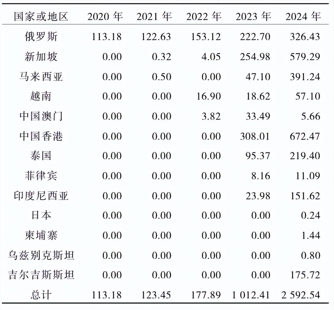 我国蓝莓鲜果自2020年首次出口俄罗斯,到2024年发展到出口13个国家或地区,出口量从2020年的113.18 t逐年上升,截至2024年为2592.54t(表2),相比上一年出口量翻了一番以上,凸显出我国蓝莓鲜果巨大的市场潜力。出口市场主要集中于俄罗斯、东欧国家及东盟国家;亚洲、欧洲和美洲等发达国家中,仅日本有少量进口。