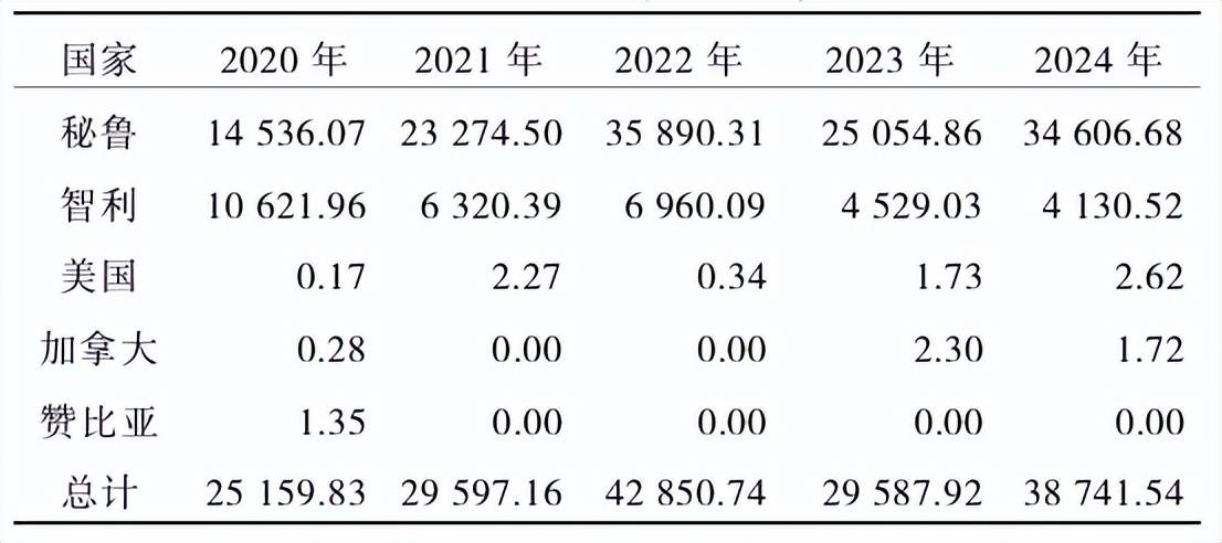 我国蓝莓鲜果自2012年开始进口后,进口量持续上升到2019年的22045.00t[8],2020年以后呈波动上升趋势,2022年达42850.74t后,2023年下降至29587.92t,2024年回升至38741.54t(表1)。进口量下降的主要原因是云南产区高质量的国产蓝莓鲜果提前到2月,填补了2020年以前8月至翌年2月国产鲜果的空档。与此同时,进口的国家由2019年的9个,下降到2020年以后的5个,其中,秘鲁和智利以南半球冬季生产鲜果的优势成为我国排名前2位的蓝莓鲜果进口国家。